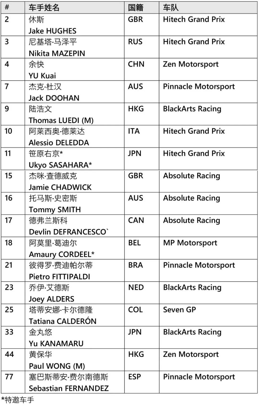 亚洲劲旅绝对车队(Absolute Racing)将派出三台赛车参赛。本赛季亮相的19岁加拿大车手德弗兰斯科(Devlin DeFrancesco)在雪邦表现抢眼,以两回合颁奖台的成绩占据积分榜第四。同队的另外两名车手分别是W系列赛(W Series)的首个总冠军、F1威廉姆斯车队发展车手英国女将杰咪·查德威克(Jamie Chadwick)和澳大利亚小将托马斯·史密斯(Tommy Smith)。中国小将曹卓因学校课程冲突遗憾缺席中东的比赛。