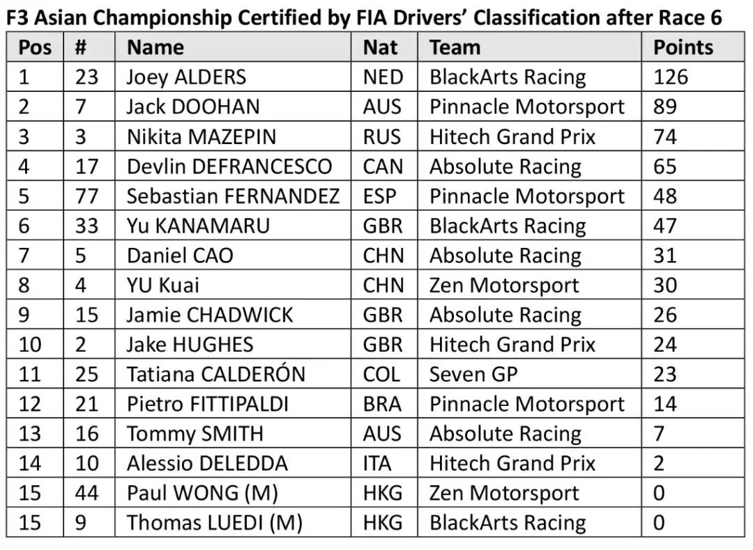 While Alders may have a healthy 37-pointlead over closest challenger Jack Doohan, who turns 17 on January 20, with nine races remaining the Australian Pinnacle Motorsport driver has ample opportunityto catch and passhis title rival. Just 15 points adrift of Doohan is quick Russian protégé Nikita Mazepin with reigning and two-time team champions Hitech Grand Prix, while 19-year-old Italy-based Canadian newcomer Devlin DeFrancesco has impressed with his consistently strong performances on the Absolute Racing squad.